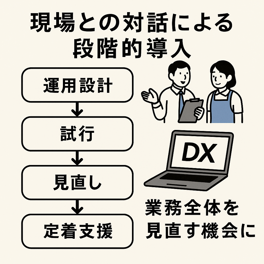 だからこそ重要なのは、“現場側との対話による段階的導入”です。ツールの導入を「運用設計」→「試行」→「見直し」→「定着支援」という流れで段階的に組み立てることで、「使い方の属人化」や「一部の人だけが使える状態」から脱却し、現場全体が自然に使える環境をつくることが可能になります。 さらに、「手が足りないからツールで効率化」と考えるだけでなく、業務全体を見直す機会としてDXを活用する視点も欠かせません。ツールは“自動化”や“省力化”のための手段であり、導入をきっかけに業務の本質を再点検することが、むしろ定着への近道になるのです。