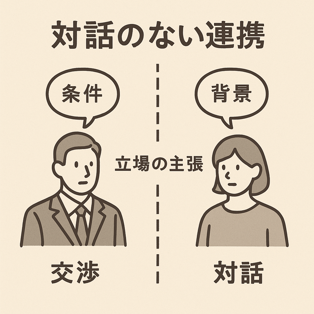 交渉は立場の主張であり、条件のすり合わせですが、対話は“背景や論理を共有する行為”です。例えば、自治体の求めるアウトカムが何か、民間が想定している収益モデルはどうか──そうした“根っこ”の部分を掘り下げる時間を取らないまま、「どう契約するか」「どこまで受託できるか」と話を進めると、互いの信頼は積み上がりません。